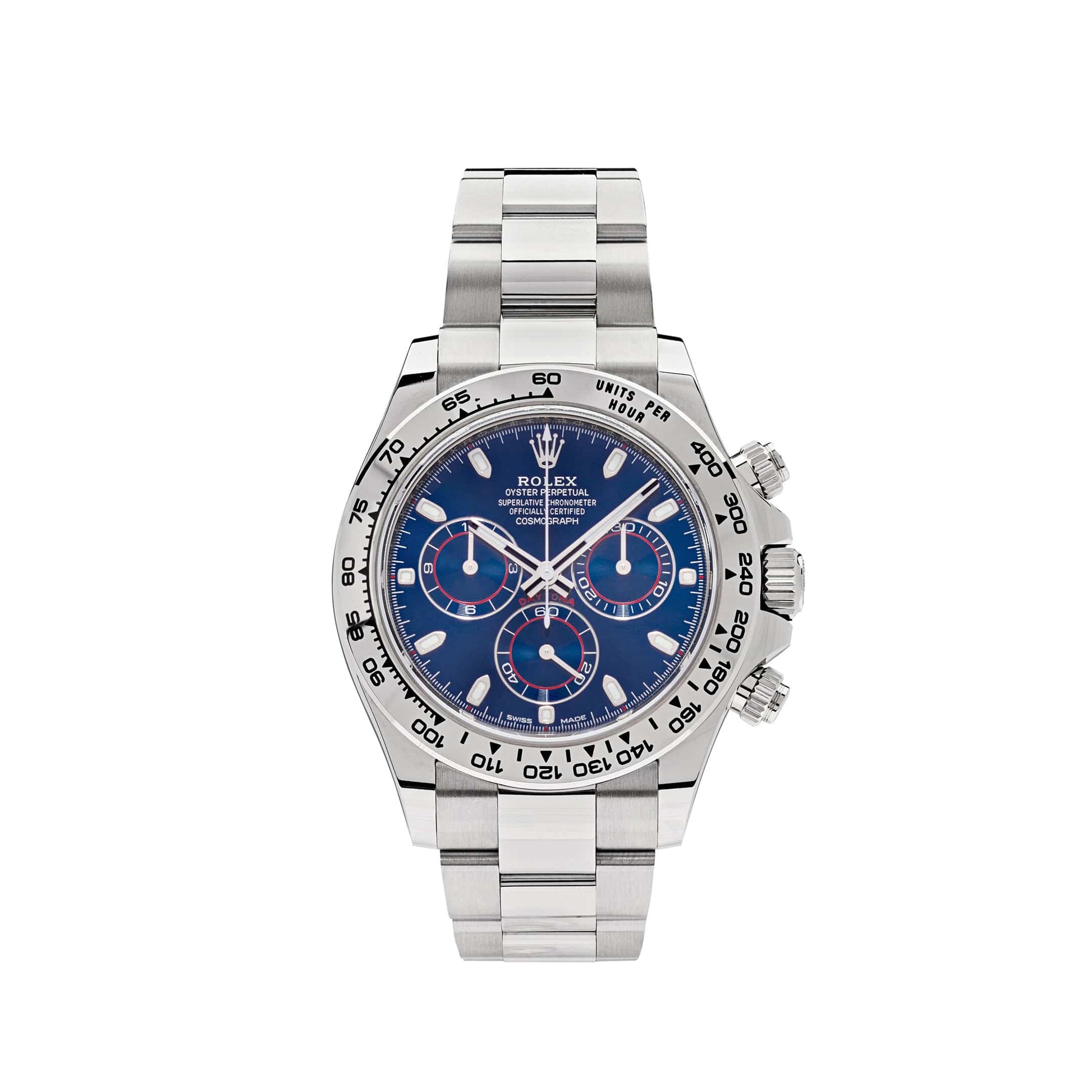 The 2025 Watch Daytona 116509 is designed in 18k white gold with a?blue dial. Luminous hands include a?Chromalight?display for optimal legibility. The engraved bezel features a tachymetric scale and hosts a high-performance Chronograph with the ability to time a speed of up to 400 kilometers per hour. With peak performance. this 2025 Watch is as sporty as it is sexy.??