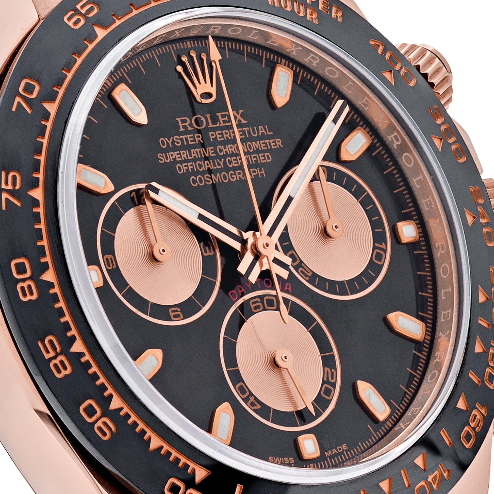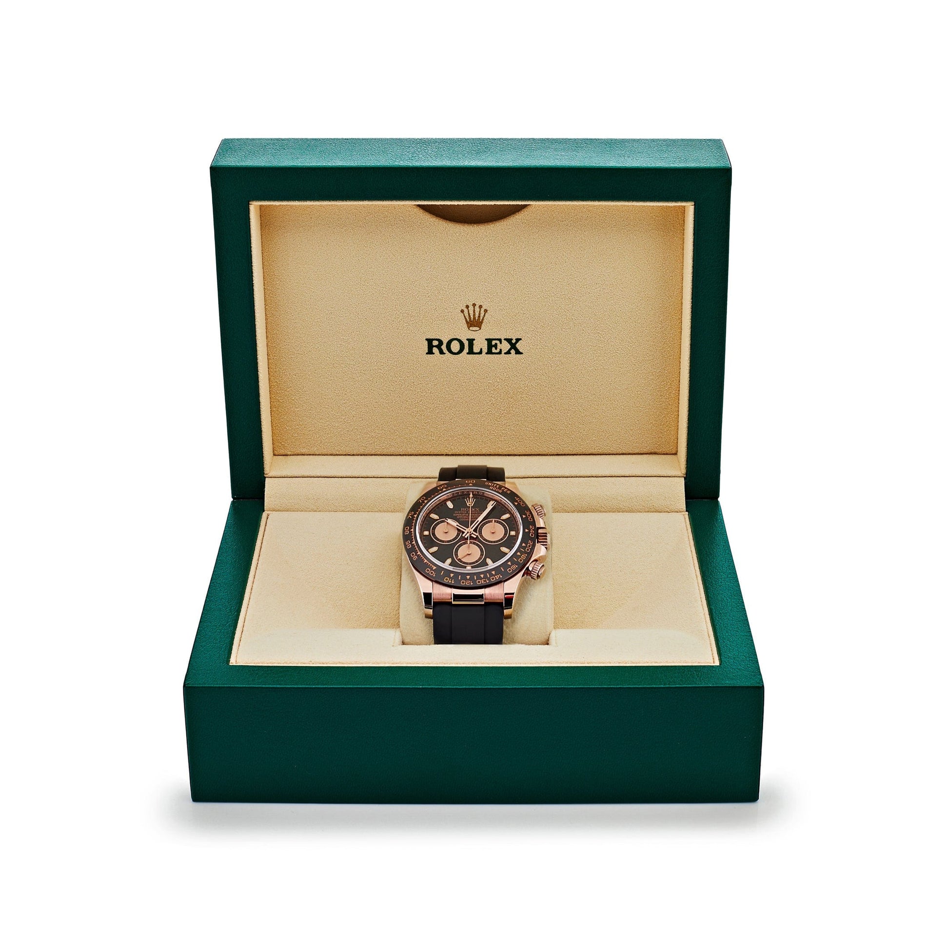 This 2025 Watch Daytona 116515LN?is designed in a 40mm 18k rose gold case. a ceramic bezel featuring?a Tachymetric scale. and a?black dial with?rose gold sub-dials.?The hour markers?and hands work with?Chromalight?display to provide optimal legibility. It is housed on a black rubber strap with a folding clasp. This 2025 Watch is the pinnacle between form. function. and fashion.?