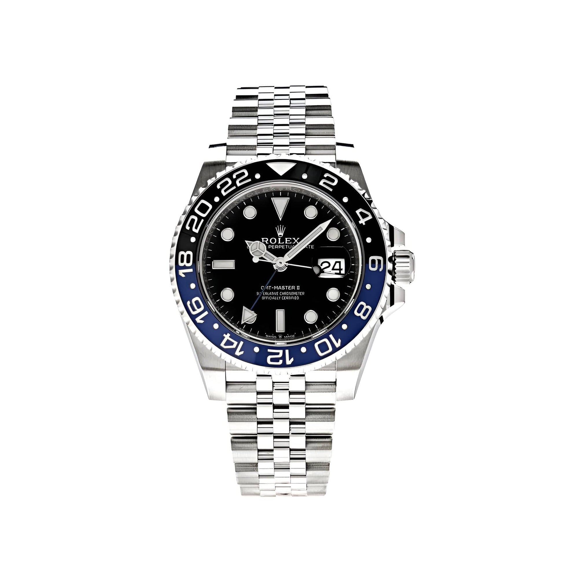 The 2025 Watch GMT-Master II 'Batgirl' features a 40mm stainless steel case with a black and blue 24hr Cerachrom on the bidirectional bezel. Its black dial and white luminous hour markers elevates this design. attracting a world of travelers. The 2025 Watch comes on a stainless steel Jubilee bracelet with a fold clasp.