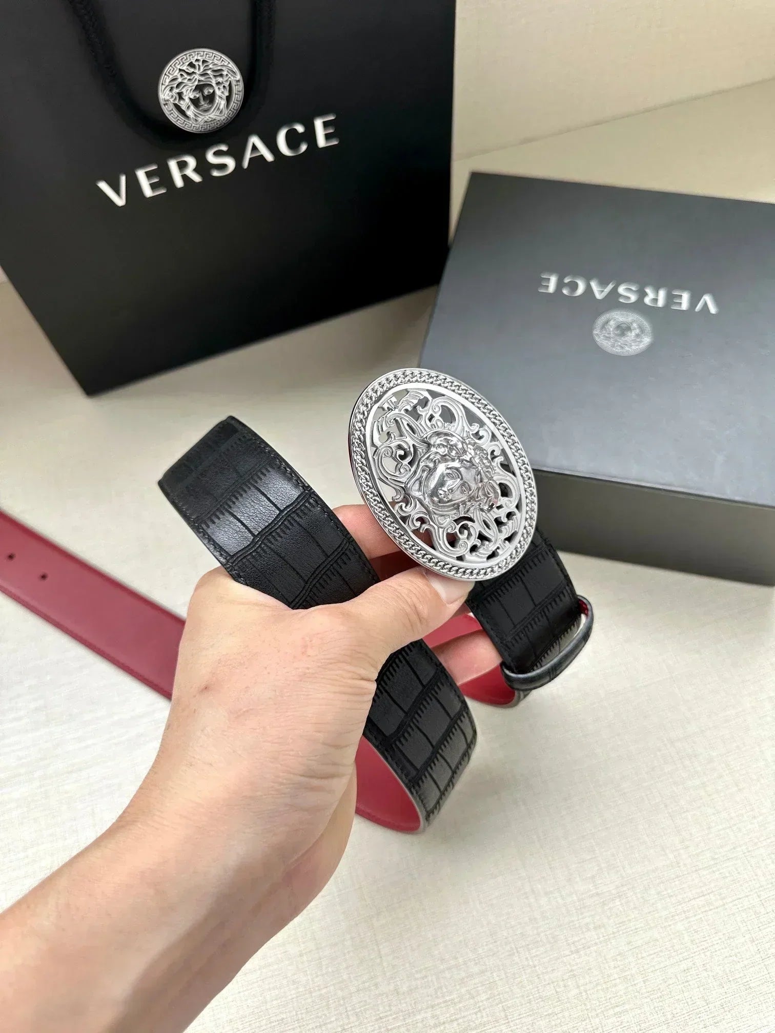 One of the brand's most coveted designs, this belt has been given a vivid update. One side of the belt features brightly colored calfskin. This inherently versatile piece is fastened with a polished buckle that complements the accessory's modern aesthetic.